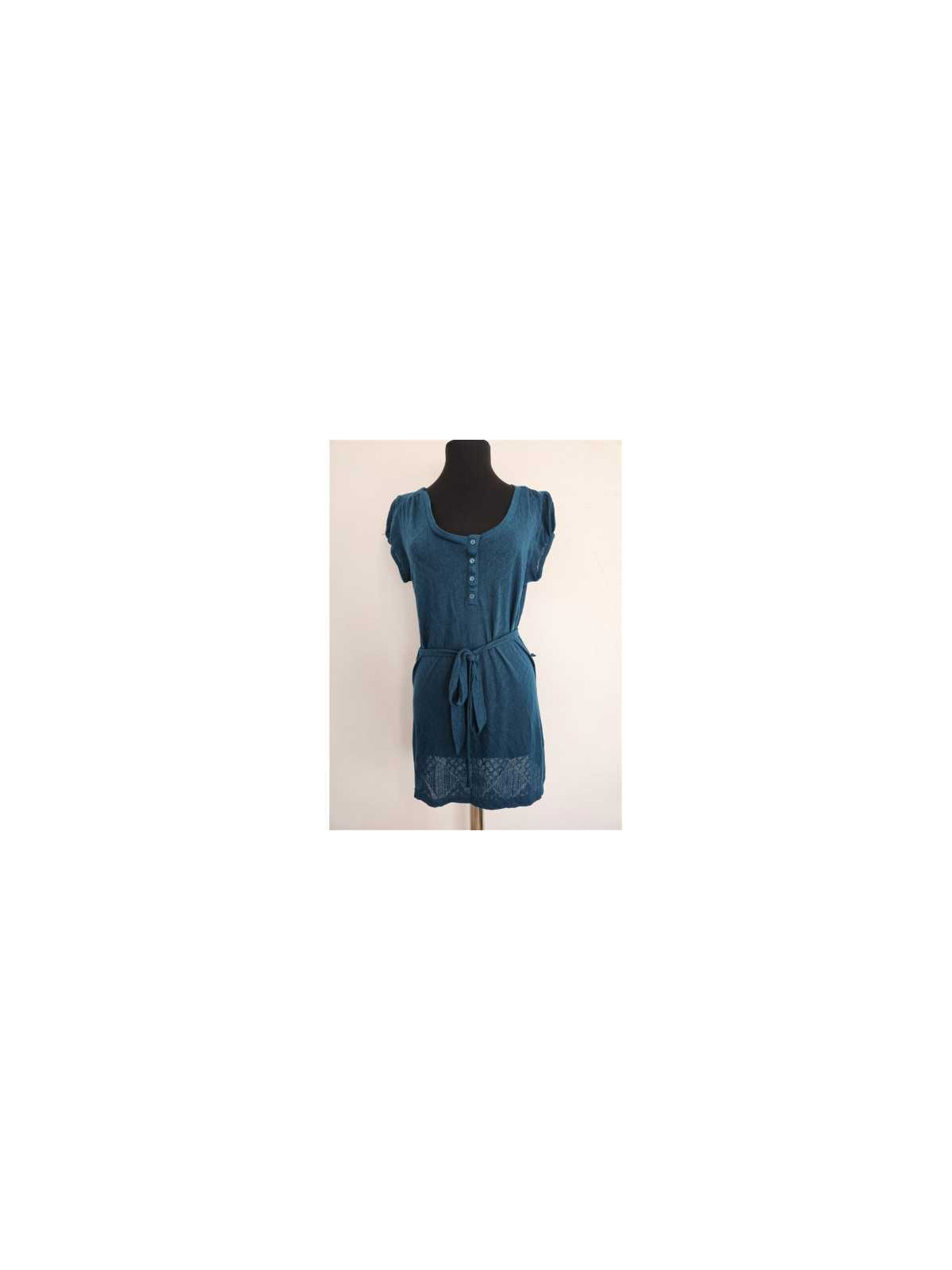 Model tricotat fin perforat cu cordon in talie, maneca scurta, decoltata la piept.