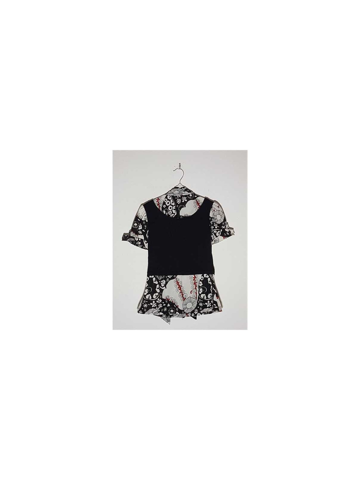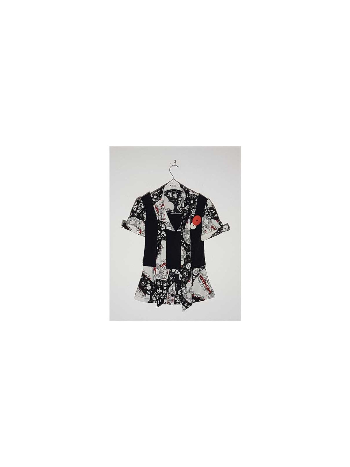 Model cu imprimeu floral, cu nasturei decorativi intr o parte, maneci scurte cu terminatii pliabile, se leaga in fata cu funda