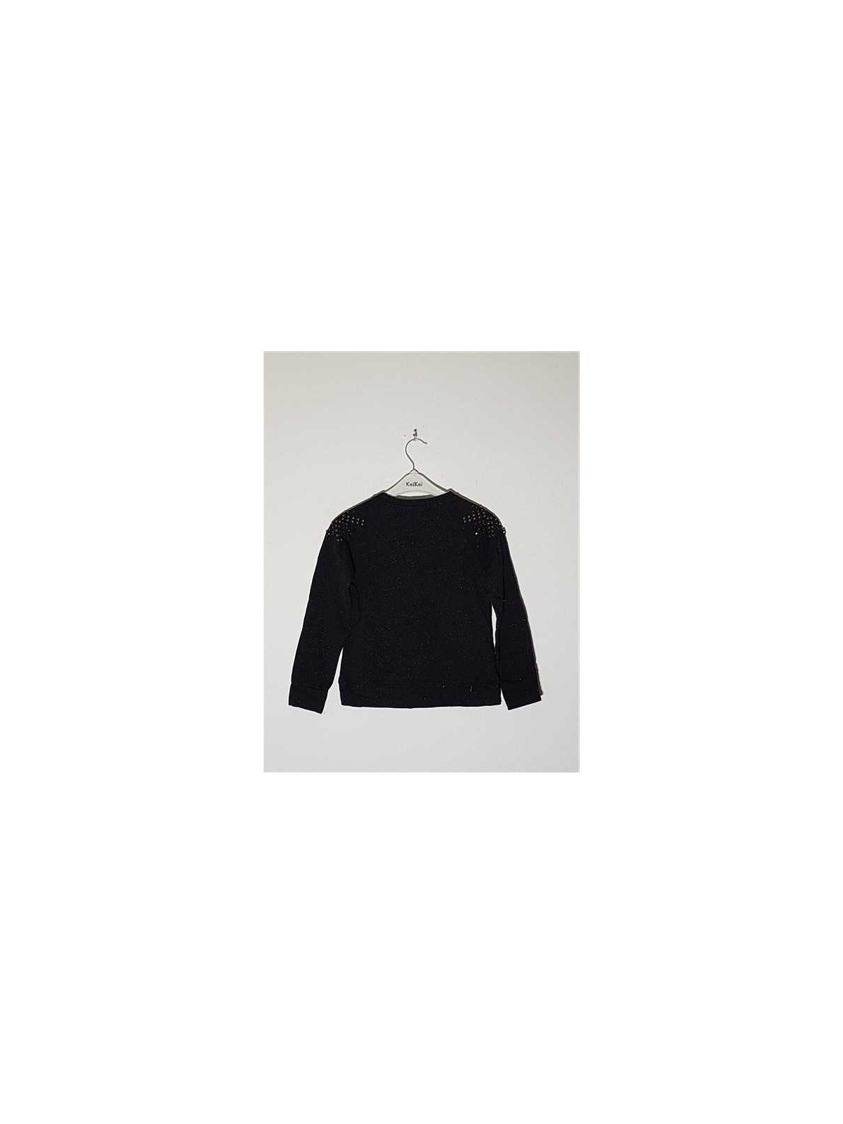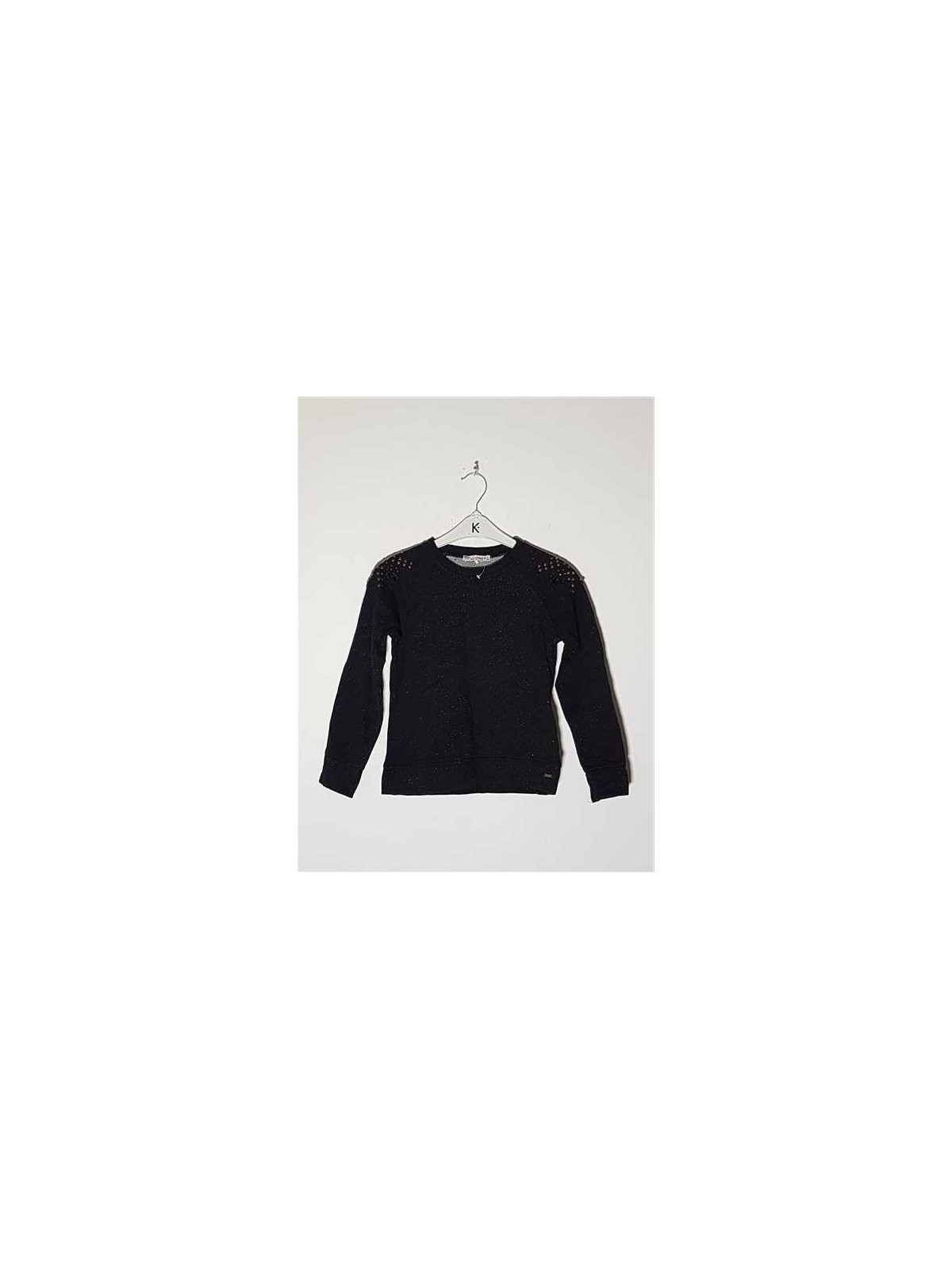 Model cu maneci lungi, decolteu rotund, accesorizata cu pietricele si tinte, cu fir metalizat culoare argintiu.
