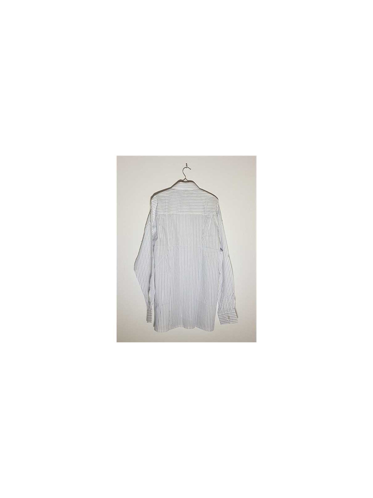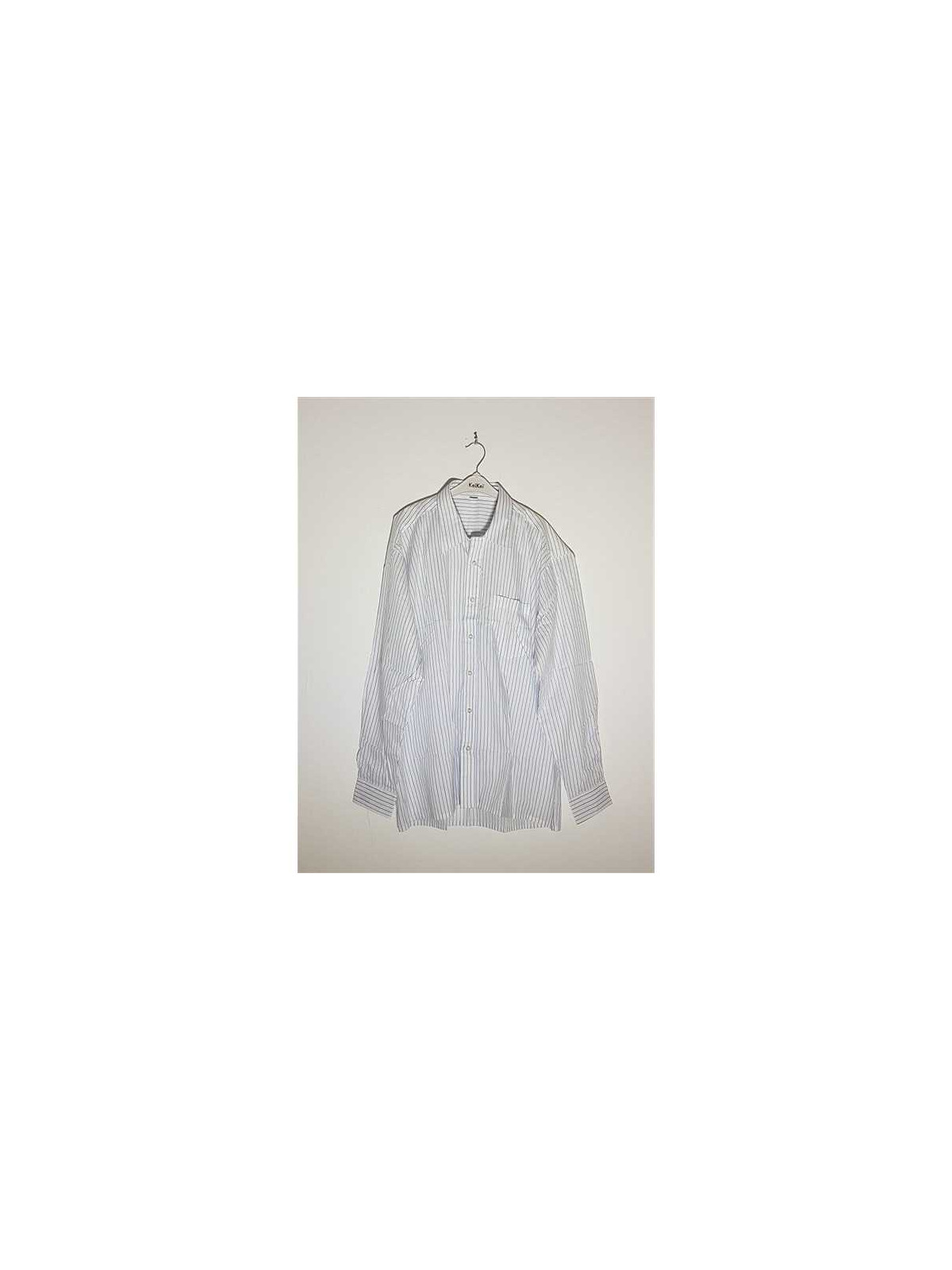 Model cu dungi culoare negru si albastru, maneci lungi, buzunar la piept, se incheie cu nasturi.