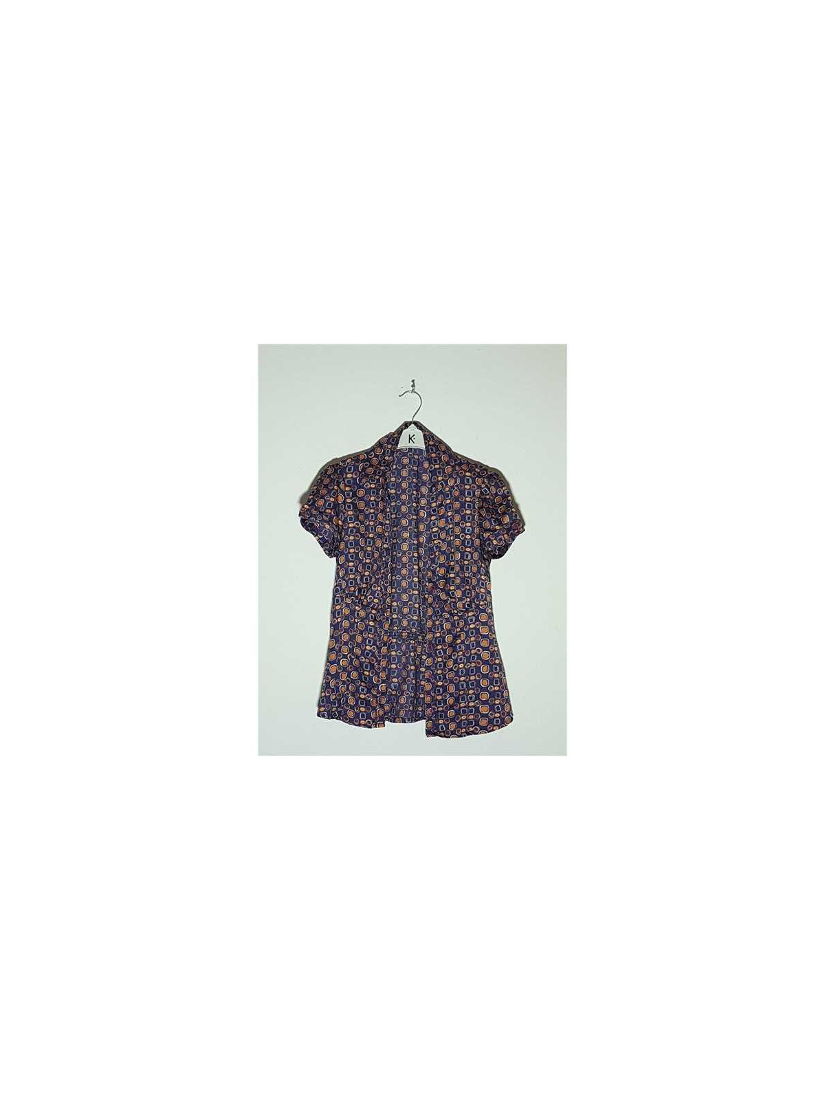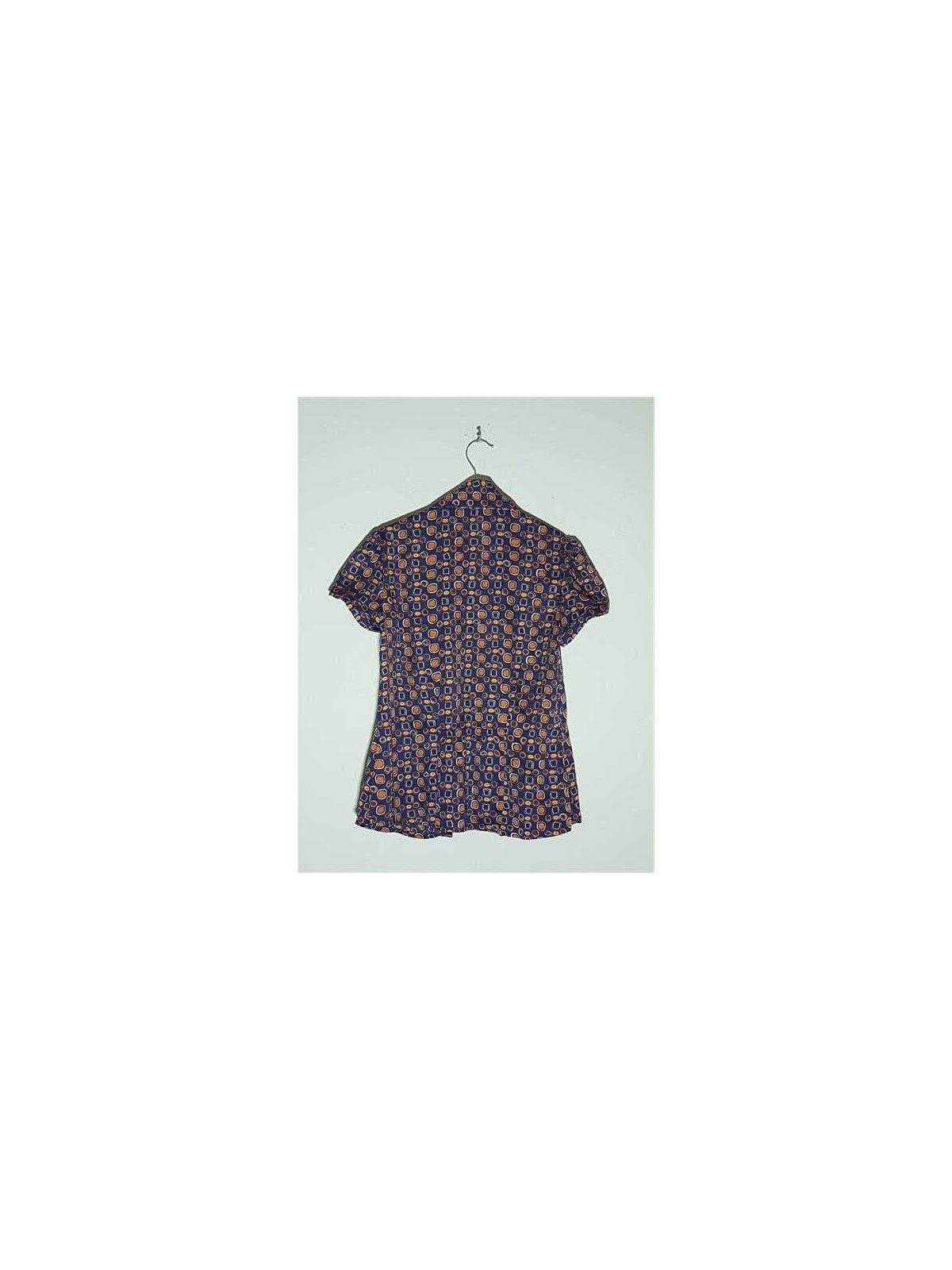 Model cu imprimeu geometric multicolor, maneci scurte, se incheie cu nasturi.