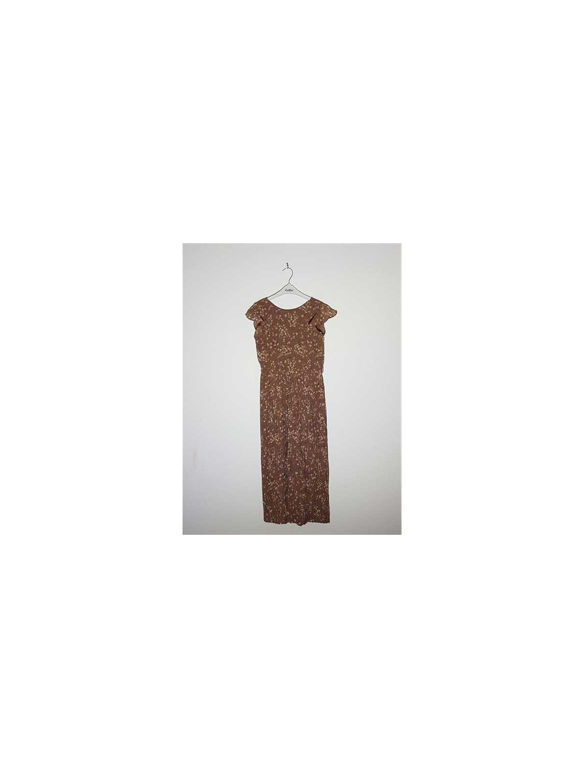 Model cu pantalon cu dublura, sus si la pantalon, print floral multicolor, cu volanas la maneci, elastic in talie si gaici pentru curea.