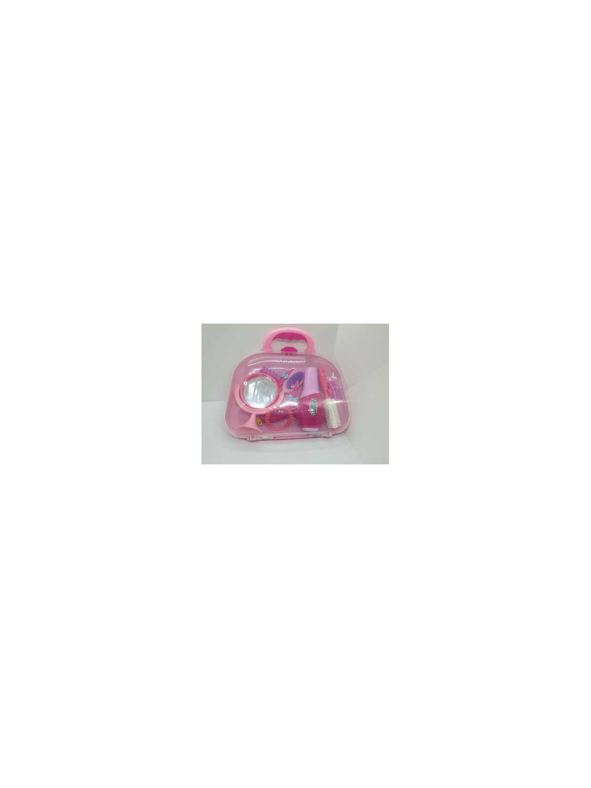 Setul include un uscator de par cu baterii, oglinda, perie de par, perie rotunda, doua bigudiuri, doua agrafe cu fundita, un clestisor, si un elastic par.