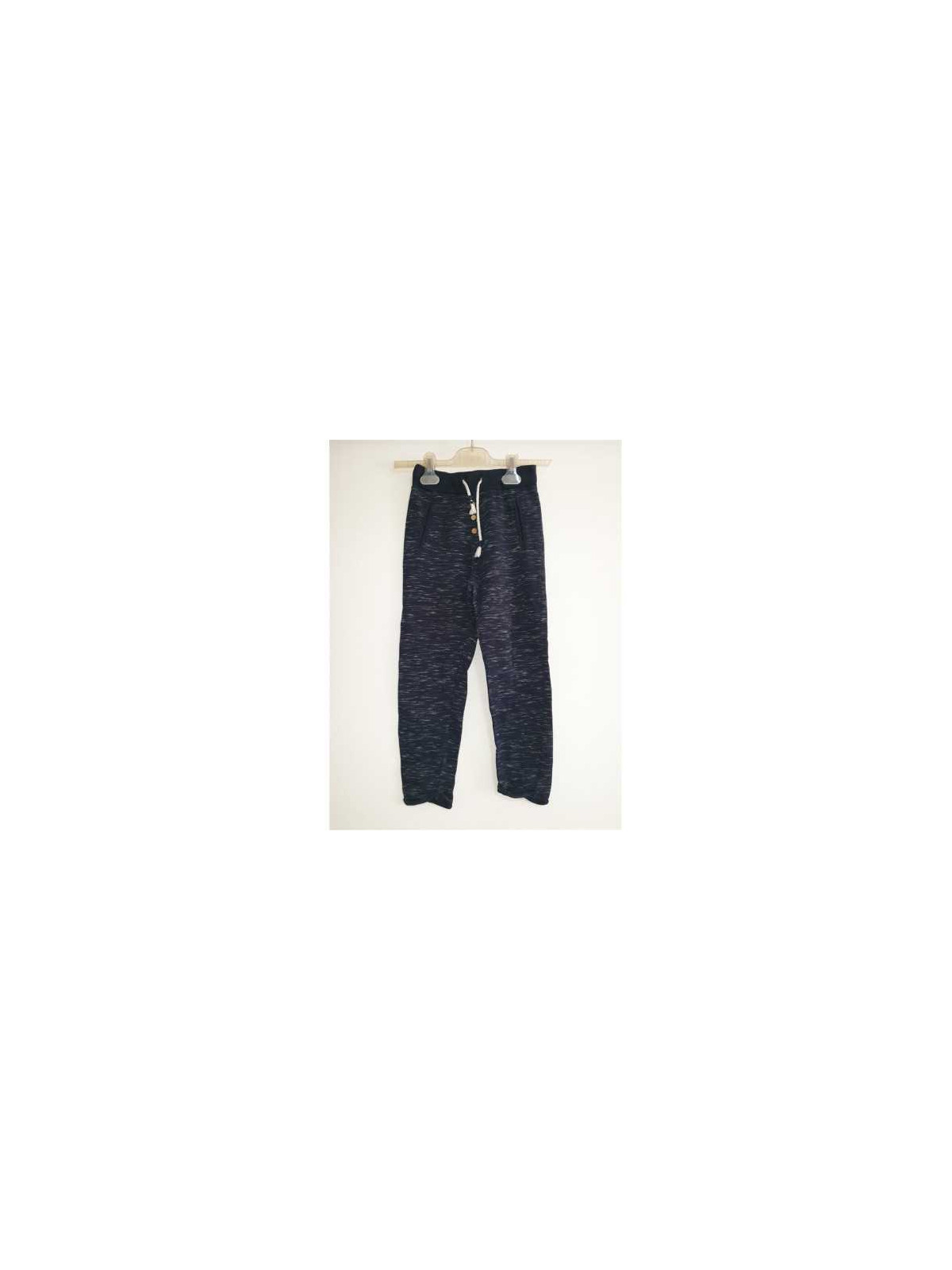 Model fara buzunare, cu nasturi decorativi, in talie cu elastic si snur.
