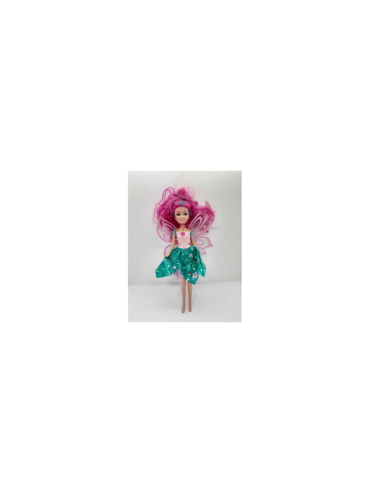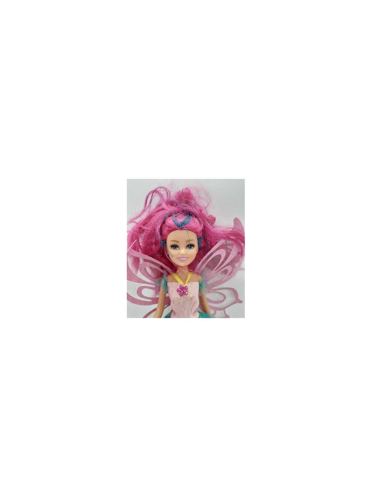Papusa cu rochita multicolora, si parul lung roz, cu suvita sclipitoare.