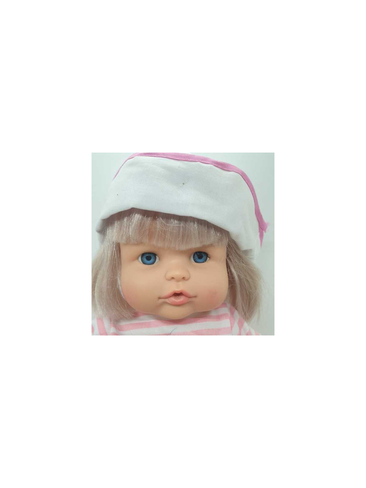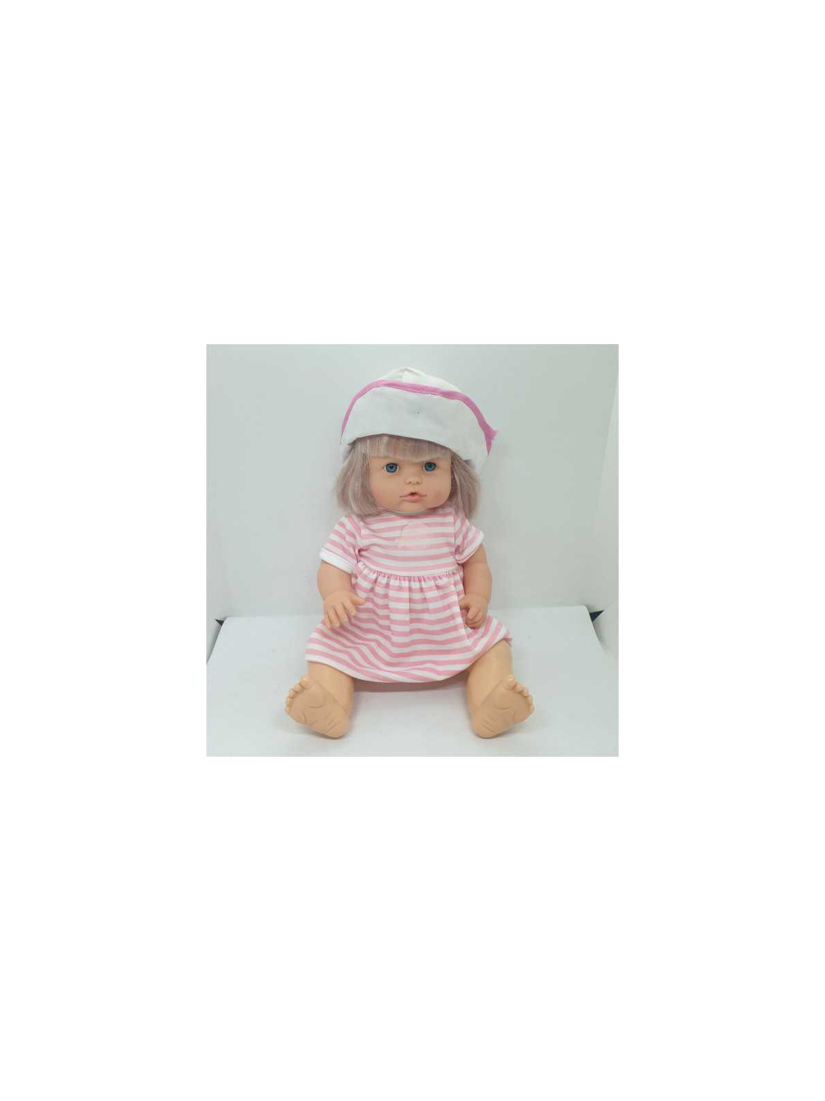 Papusa din plastic cu rochita cu dungi si palarie.