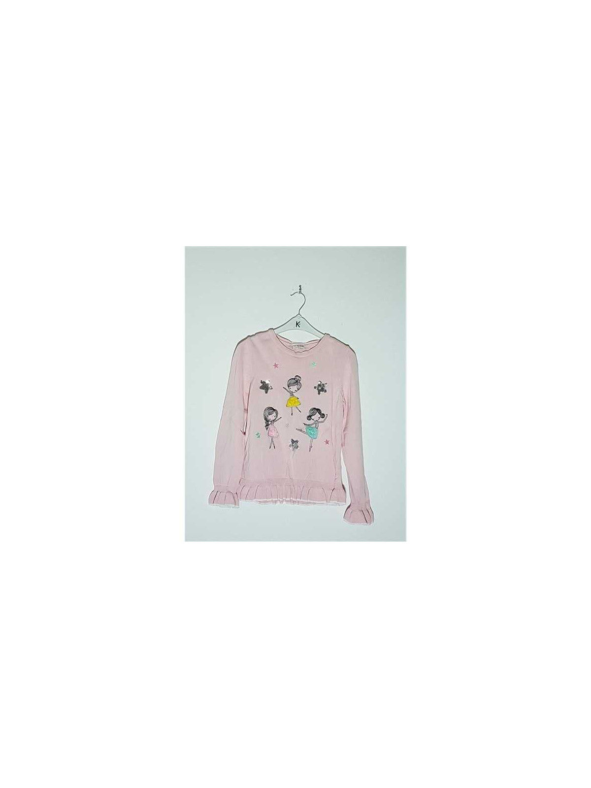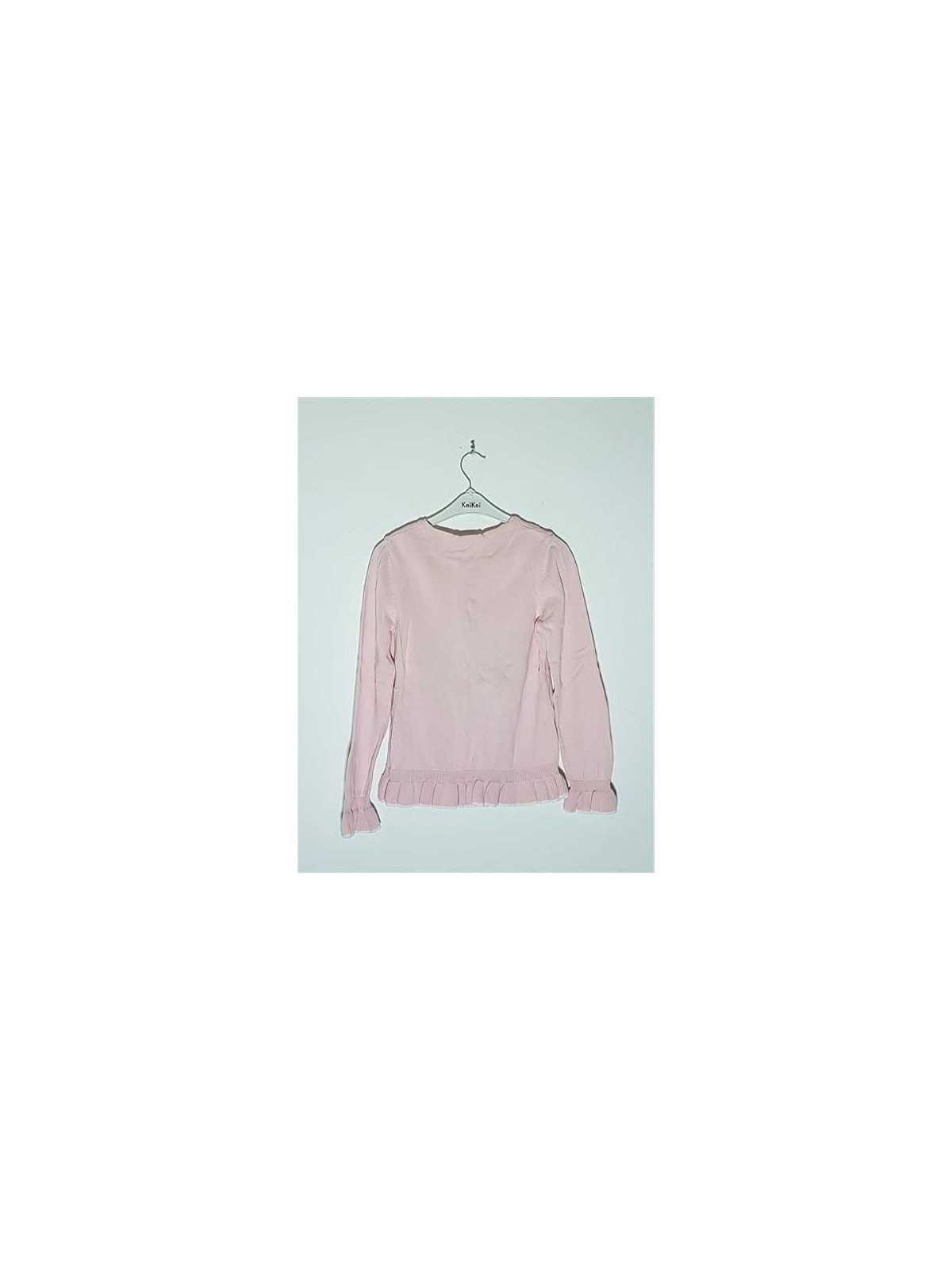 Model tricotat, cu imprimeu multicolor, cu volane la maneci, si jos.