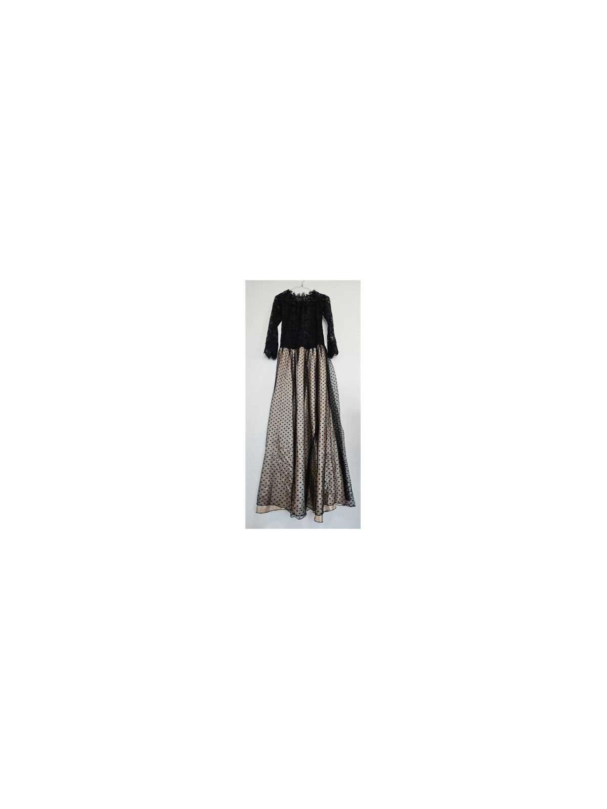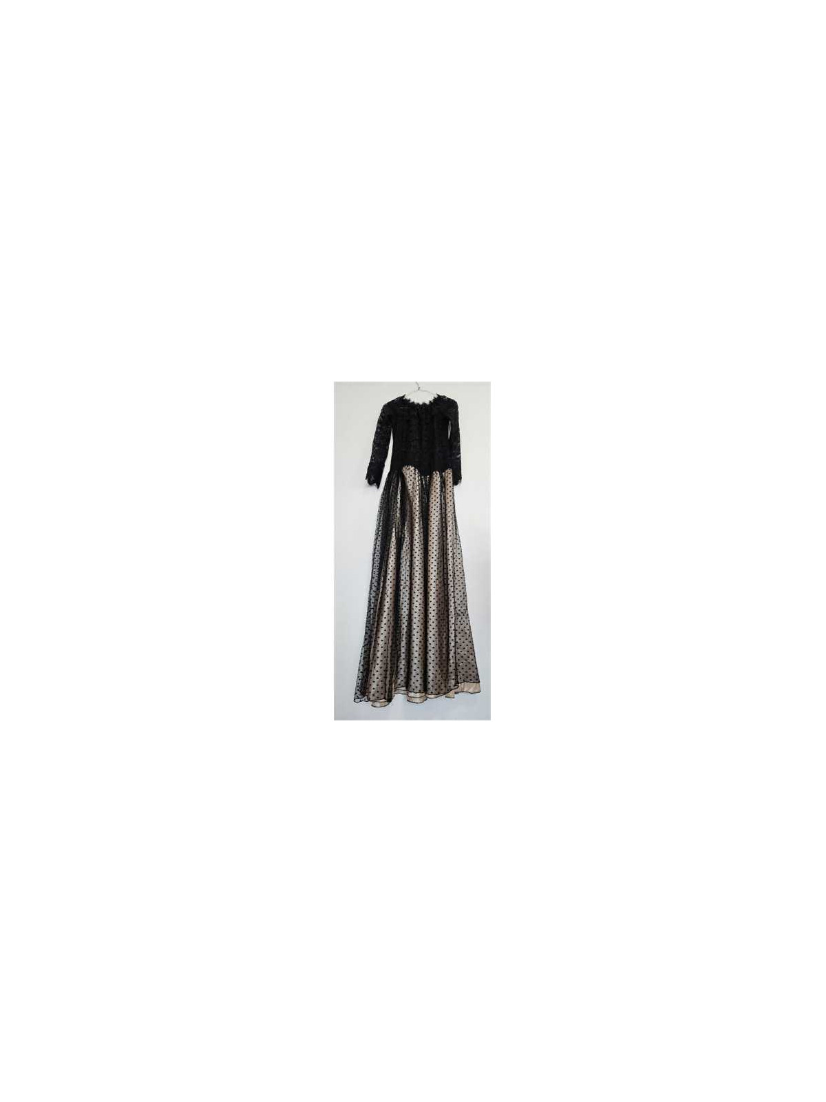 Model cu maneca lunga, partea de sus cu aspect dantelat sus la baza cu elastic, jos pe deasupra material transparent tip tul, despicat pana la jumatate.