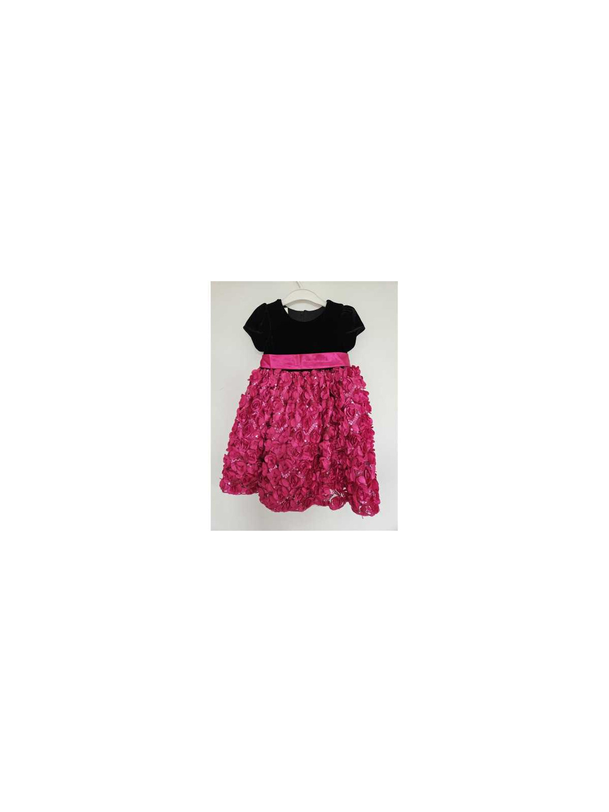 Model partea de sus tip catifea, jos cu floricele si paiete, se leaga cu funda in talie, la spate cu fermoar.